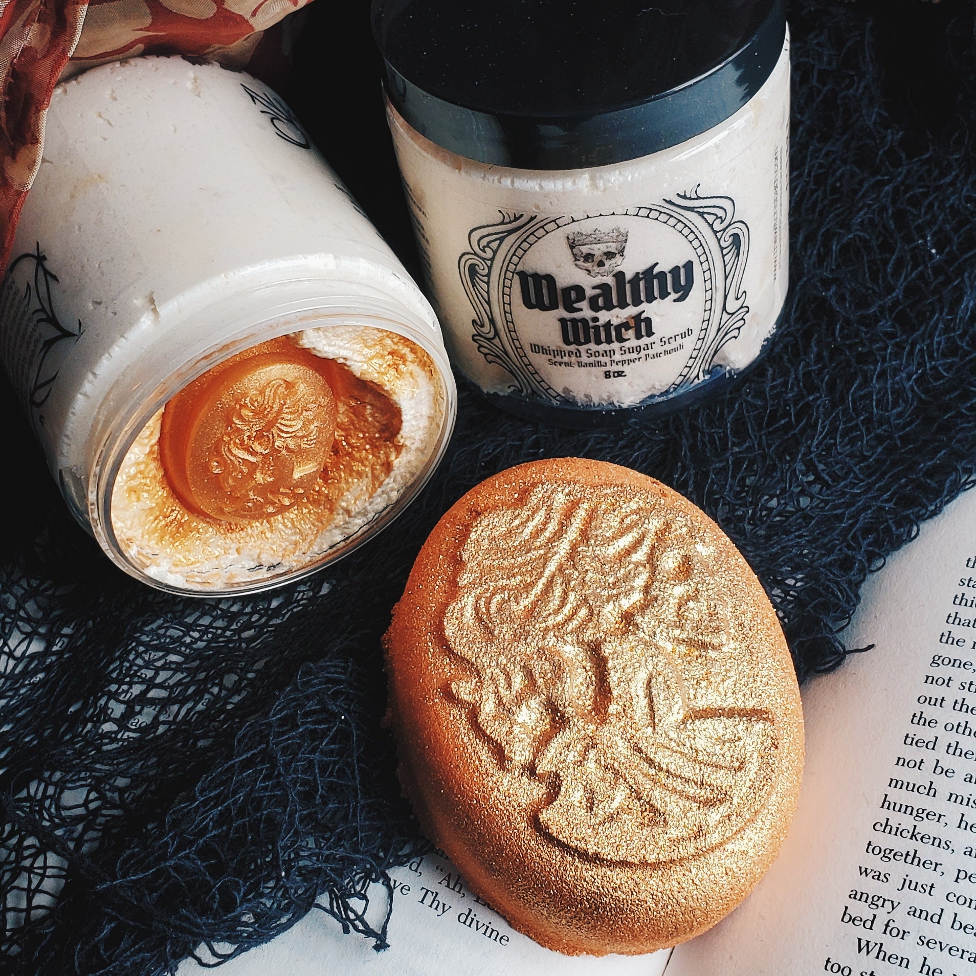 An earthy, smoky, and sweet scent, Wealthy Witch bath bomb is a vanilla, patchouli, pepper scent with golden, biodegradable glittery flecks. This item has stayed in our top 5 best sellers list since its first debut!